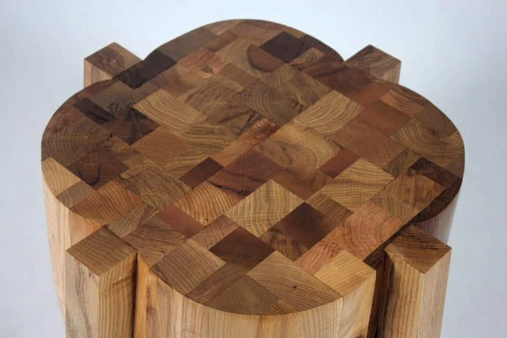 There are 8 identifiable wood species that make up this side table and stool form, all reclaimed.